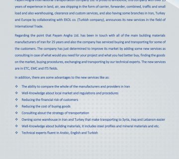 Payam angha international transportation company Ltd. has been already in touch with most of the main manufactures of Iran and it’s a well-known company in the Iranian and also the Turkish market.